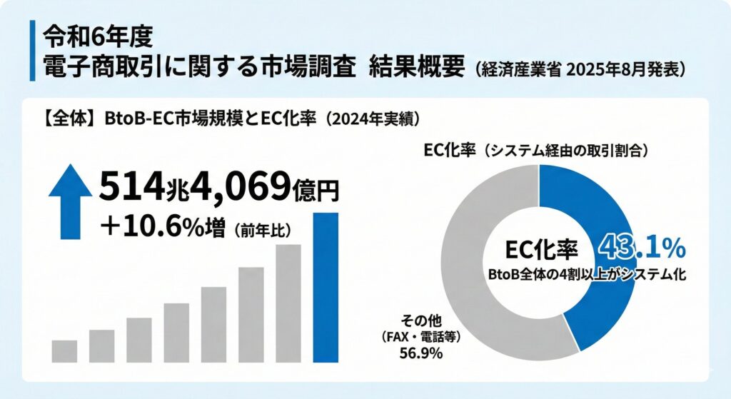 経済産業省が2025年8月に発表した最新の「令和6年度 電子商取引に関する市場調査」によると、2024年の日本国内におけるBtoB-EC(企業間電子商取引)市場規模は、514兆4,069億円(前年比10.6%増)という過去最高額に達しました。