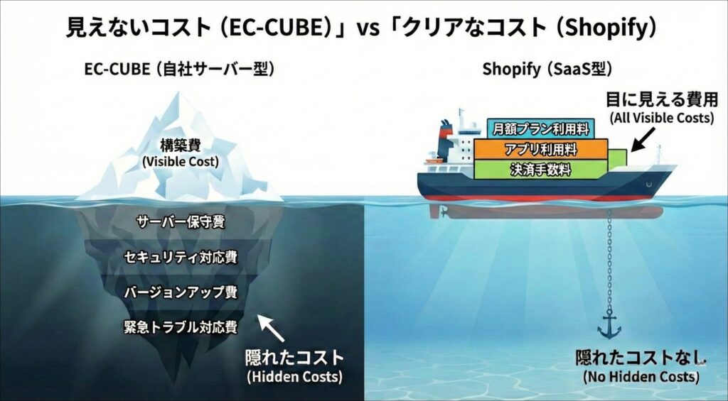 EC-CUBEは無料のソフトですが、サーバー代やセキュリティ対応などの「見えない保守コスト」が膨らみがちです。一方、Shopifyは月額費用がかかりますが、保守は全てShopify側が行うため、浮いた予算をマーケティングやアプリ導入に回すことができます。